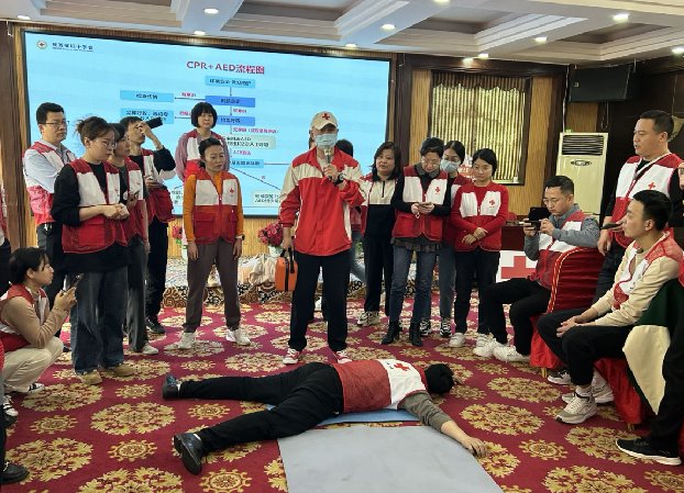 培训中,西安市红十字会专业老师以理论讲授、现场演示、实践操作等方式相结合进行授课,结合近年来发生在身边的鲜活事例,通过播放幻灯片和视频、展示实物、现场演示等形式,向学员们强调了应急救护“黄金四分钟”的重要性。随后,老师从跌倒体位到复苏体位进行系统案例情景演绎,逐一讲解了胸外按压、人工呼吸,AED的使用规范,并进行现场模拟训练,实操心肺复苏、人工呼吸。