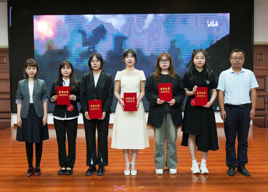 王铃琪、蒋波为获得优秀奖的同学颁奖