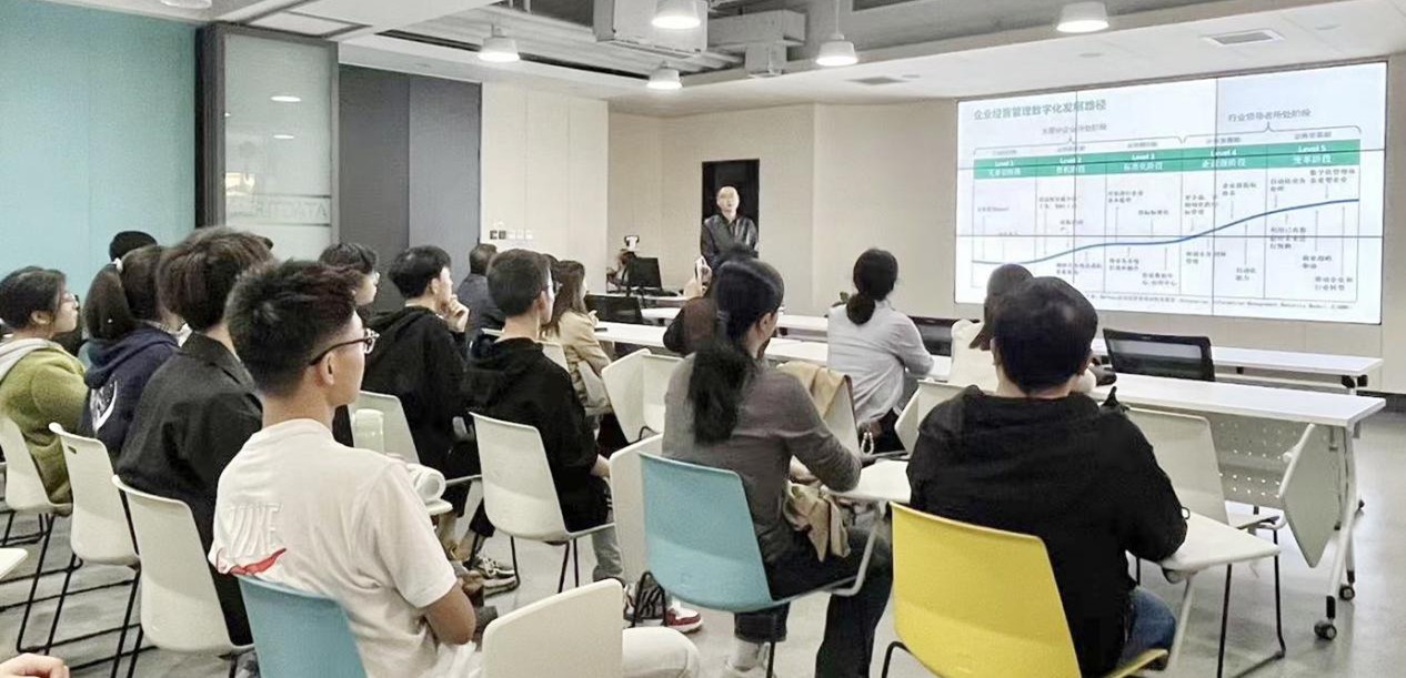 参观后,美林公司的高级咨询顾问吴冠涛在综合会议室为师生们分享了大数据应用的业务流程和具体的大数据建设案例。他以企业进行经营管理数字化建设为例,介绍了此类案例的一般业务流程,并以深圳市特区建设发展集团有限公司的经营管理数字化建设为例,讲解了该企业数字化建设前的业务现状、业务痛点、项目目标和解决方案架构,以及最后如何达到“一企一屏”,满足国资监管要求,实现一体化管控,可视化管理案例故事。