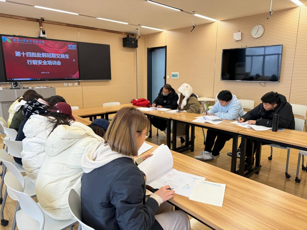 本网讯 为做好公司2024年短期交换生出国前安全教育工作,12月15日中午,国际公司在1503教室召开第十四批赴韩短期交换行前安全教育培训会。国际公司经理陈德,员工留学事务服务中心副主任李君,10名赴韩国交换学习的员工及家长参加本次会议。