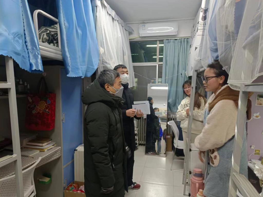 走访过程中,陈德强调,近期呼吸道传染性疾病多发,同学们在宿舍要多通风,勤消杀,做好个人安全防护。在宿舍生活期间,一定要注意安全,严禁宿舍违规用电和饲养宠物。他勉励同学们,在临近期末考试的最后两周内,天气严寒,要尽量减少离校外出,在校内认真复习,顺利通过考试。对男生公寓走访过程中,陈德特别叮嘱爱玩游戏的同学要潜心学习,适度娱乐,劳逸结合,避免过量。
