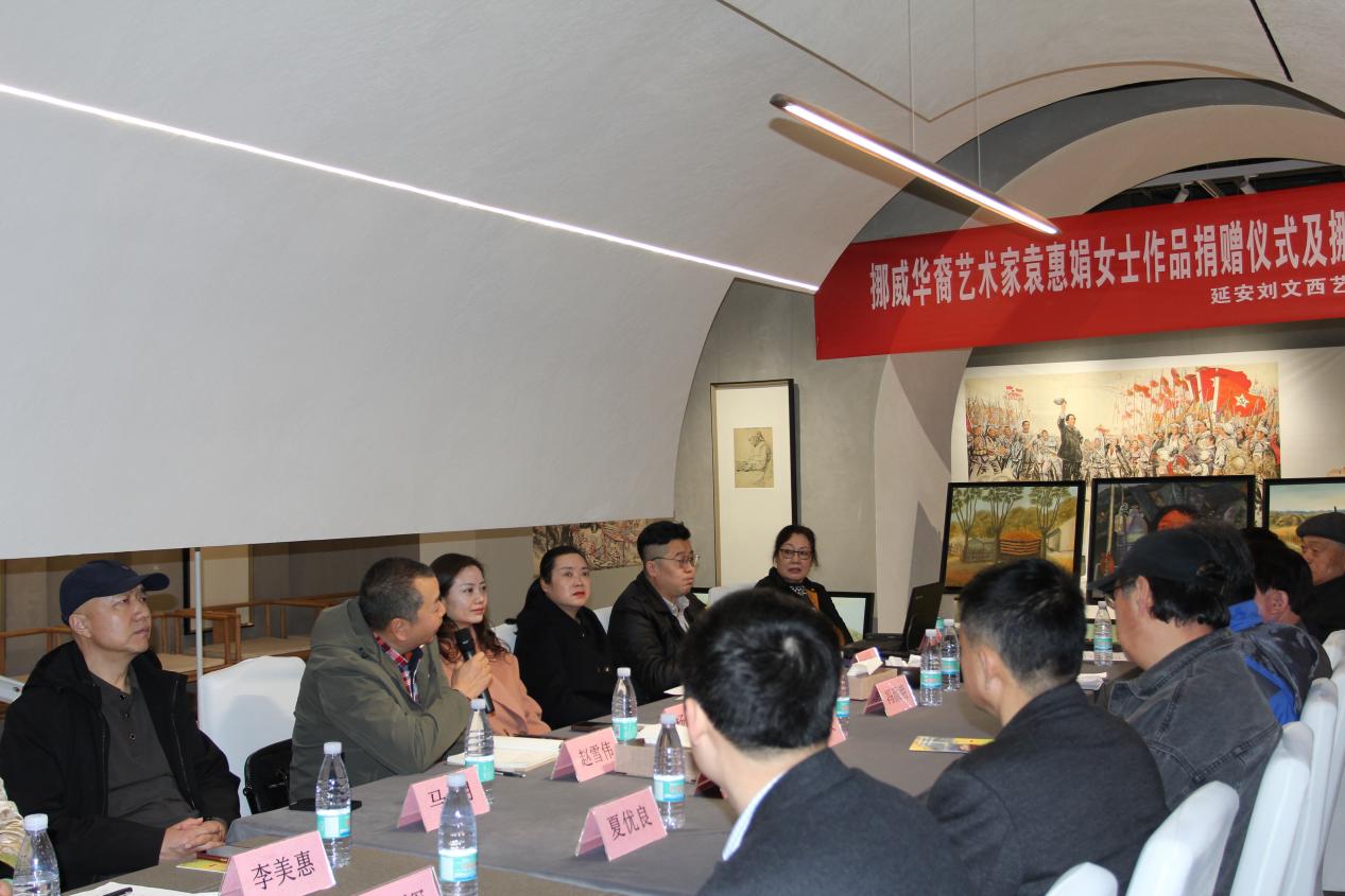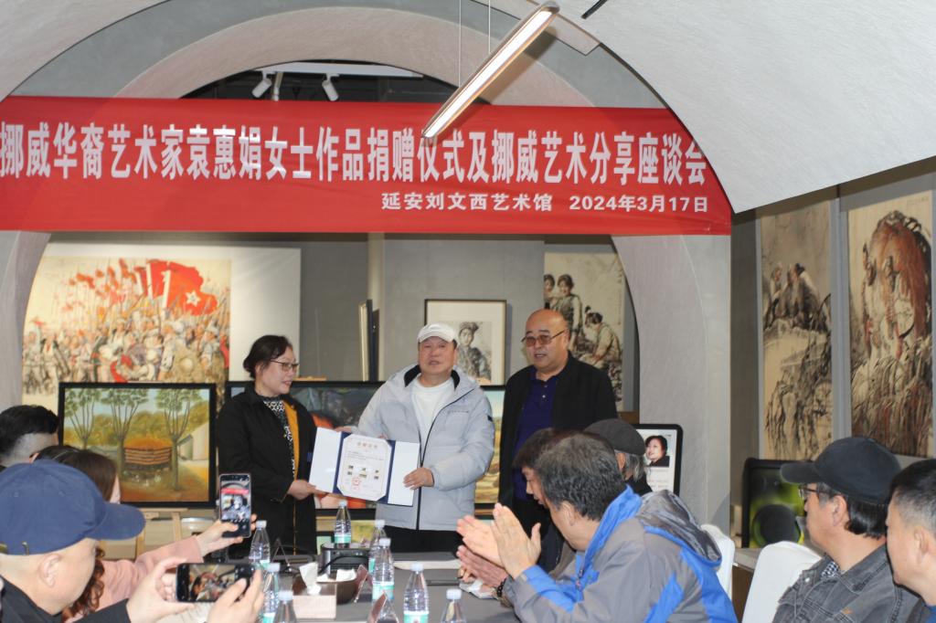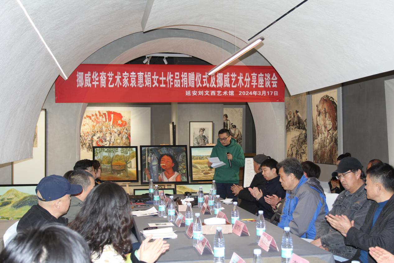本网讯 2024年恰逢中挪建交70周年,3月17日上午,挪威华裔艺术家袁惠娟女士作品捐赠仪式及挪威艺术分享座谈会在延安刘文西艺术馆隆重举行,公司韦德体育经理刘丹、执行经理赵雪伟以及教师代表参会。会议由延安市文联副主席王黎明主持。