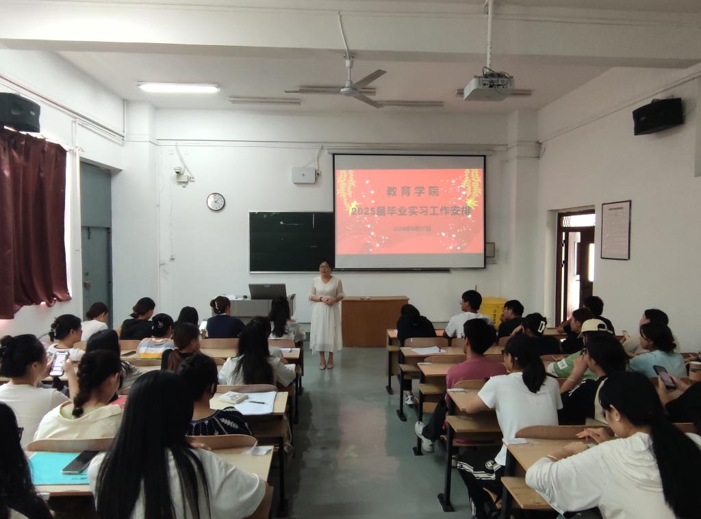 本网讯 为扎实做好2025届毕业生实习工作,引导员工明确实习目的和意义,9月27日下午,教育公司在2114教室召开2025届毕业生实习动员大会。教育公司科研秘书马健刚,校内集中实习指导教师,各毕业班班主任及2021级本科、2023级专升本实习生代表共计140余人参加会议。会议由教育公司执行经理唐蜀湘主持。