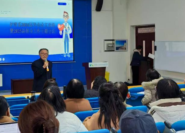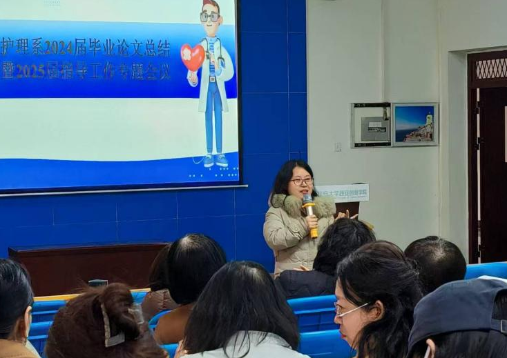 会议伊始,护理系主任岳鹏莹对2024届毕业论文专家评审意见进行了深度复盘。针对2025届毕业生论文,她从选题、过程管控以及导师赋能三个方面进行了详细部署。