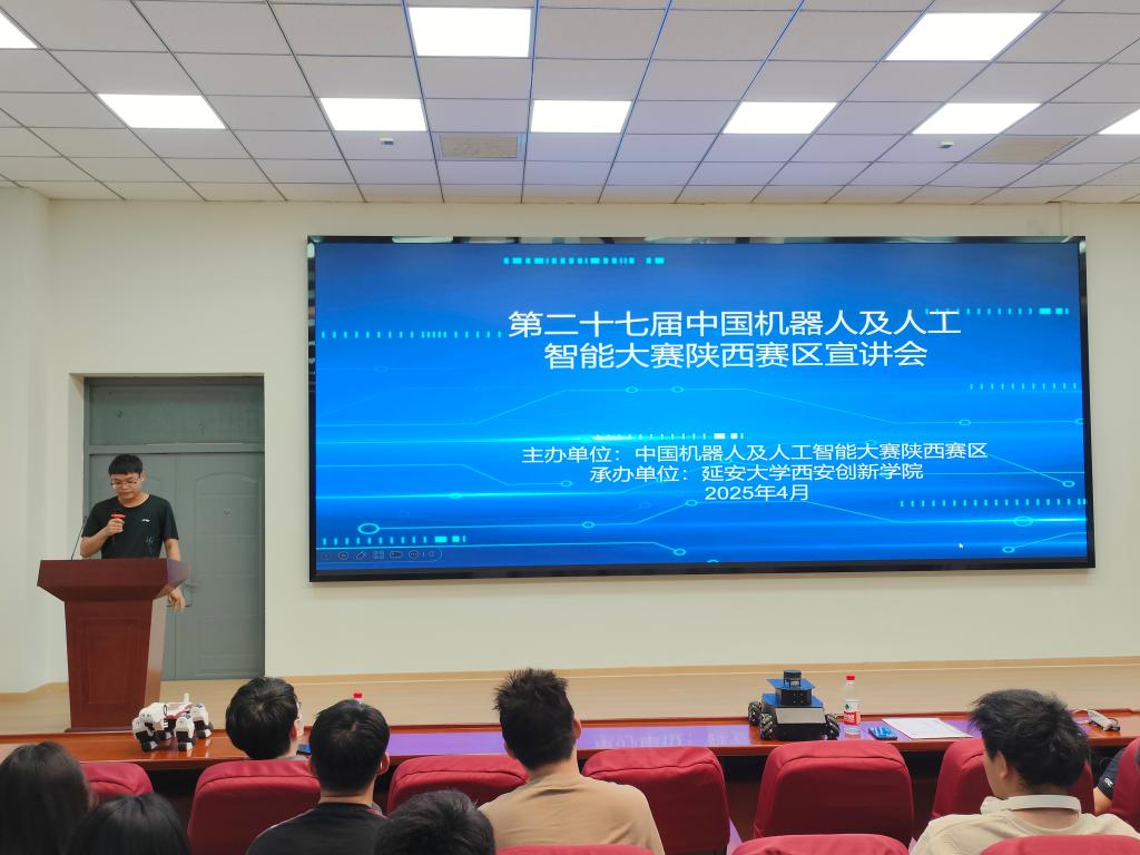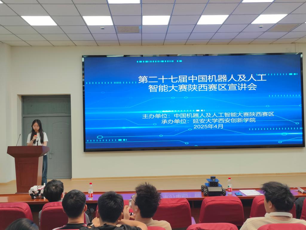 本网讯 4月23日,韦德体育在樊川大讲堂举办中国机器人及人工智能大赛陕西赛区宣讲会。陕西赛区秘书长李亚卓受邀解读赛项规则。校内指导教师、参赛员工代表及大一新生120余人参会。