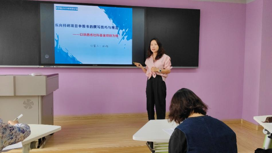 肖娜结合自身主持陕西省社科基金项目的丰富经验,系统解析了纵向科研项目申报的关键环节。她通过对比分析陕西省社科基金、国家人文社科项目等纵向课题的特点,强调申报者需立足学术前沿,注重跨学科协同创新。在申报书撰写方面,肖娜从题目凝练、研究综述、框架设计到经费预算,逐项剖析了高水平申报书的核心要素,特别指出“问题意识要锐化、研究路径要可视化、创新点要可验证”三大要诀。她还现场演示了AI辅助文献梳理、研究方案优化等实用技巧,引发了参会教师的浓厚兴趣。