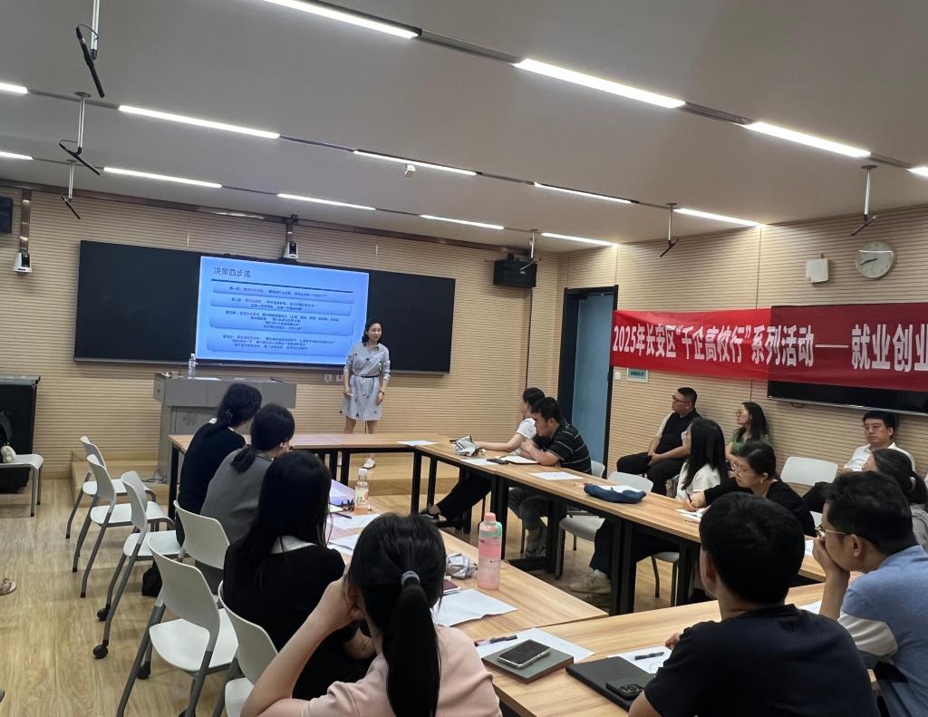 培训现场,唐黎围绕毕业生就业观念方面的“认知”与“决策”两大核心维度,通过对典型案例的深入剖析,系统阐释了行业发展趋势与个人职业定位的内在联系。她指出,在快速变化的市场环境中,建立科学的职业认知体系至关重要,要系统梳理自我评估、目标设定环节,指导构建全面、动态的认知框架。在决策方法论层面,唐黎着重介绍了"决策平衡轮"等实用工具,通过情景模拟、小组讨论等互动形式,帮助大家理解如何在就业创业过程中综合考量经济收益、个人成长、社会价值等多元因素,从而做出理性且契合自身发展的科学决策。
