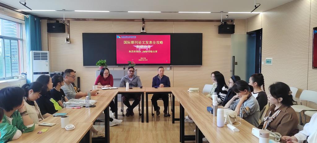 本网讯 为提升教师科研能力,9月19日下午,国际公司在1503教室举办了“国际期刊论文发表全攻略”专题科研沙龙。本次活动特邀Dr. Jafar担任主讲嘉宾。国际公司全体教职工参加活动,经理陈德主持。