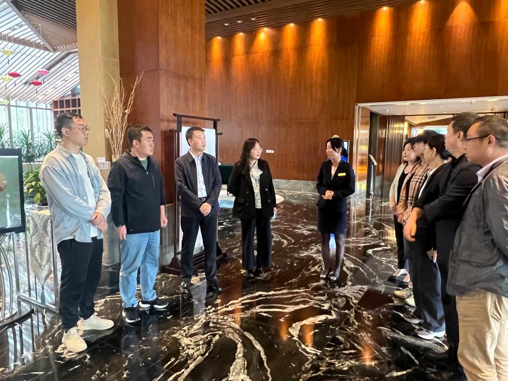 杭涛一行在业务经理董茜的陪同下实地参观了酒店的客房区、餐饮宴会区、文化展示区等,详细了解了酒店的运营模式、服务标准、文化特色及人才需求结构,听取了酒店对员工专业素养、服务能力的具体要求,为后续人才培养与输送提供了实践参考。