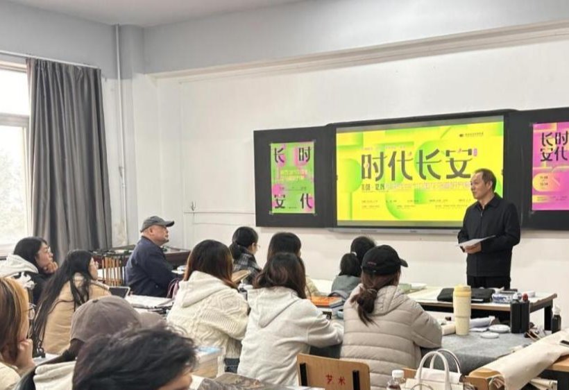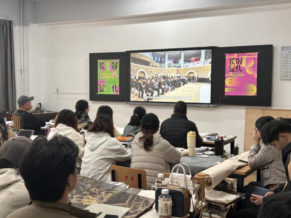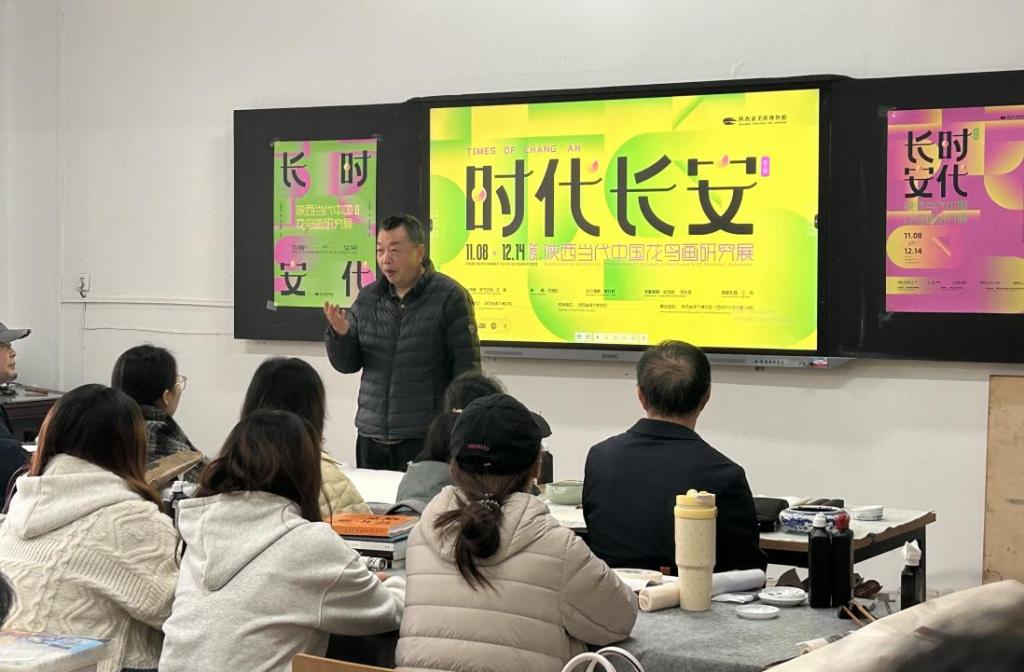 随后,现场播放“时代长安——陕西当代中国花鸟画研究展”画展专题纪录片,让师生全面深入了解陕西当代花鸟画的发展脉络与创作现状。穆亚威作为艺术家代表,以“陕西花鸟画的传承与当代创新”为主题,结合自身创作经历,阐述了陕西作为国画创作重镇的历史渊源,并分析了其当代发展优势。他强调:“青年一代是中国画传承发展的希望所在,花鸟画创作既要扎根传统,从古代大家作品中汲取养分,更要走出画室、走进自然,在写生中观察花鸟鱼虫、体悟自然百态,让作品充满生活气息与时代温度。”同时,他鼓励同学们通过鉴赏优秀作品、参与艺术实践提升美育素质,筑牢艺术发展根基。
