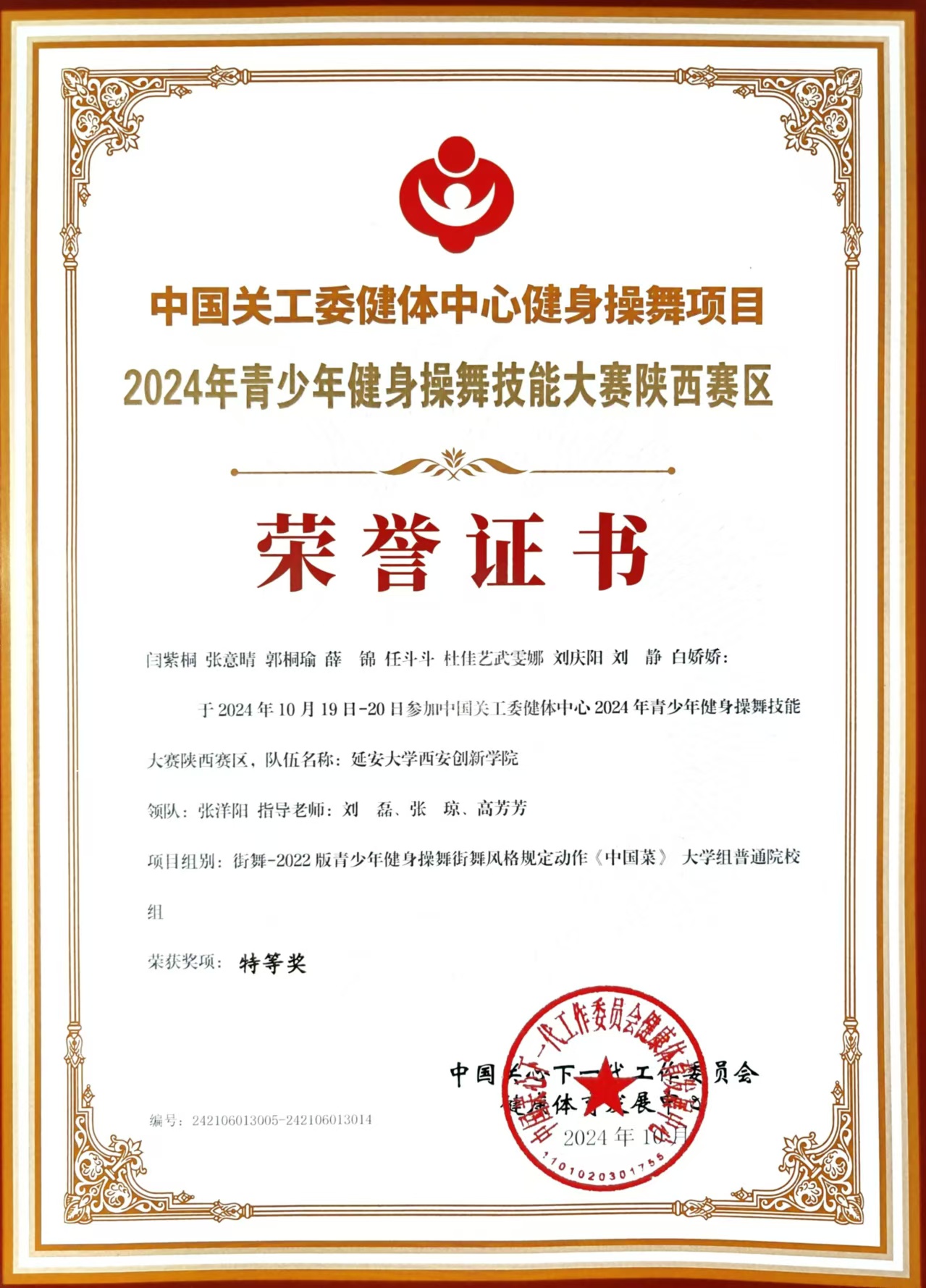 本网讯 10月20日,由中国关心下一代工作委员会健康体育发展中心、西安市长安区文化和旅游体育局主办的2024年青少年健身操舞技能大赛(陕西赛区)顺利落下帷幕。经过激烈的角逐,公司代表队荣获街舞规定套路“特等奖”。