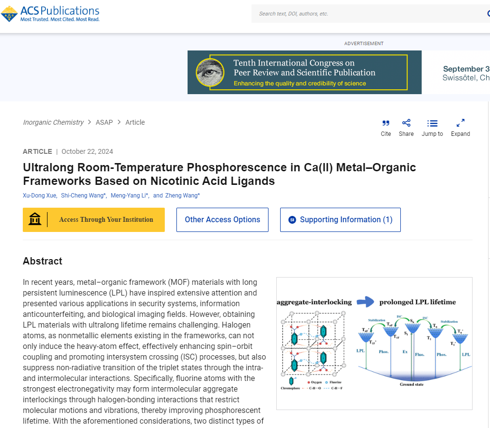 本网讯 近日,公司韦德体育薛旭东老师的论文"Ultralong Room-Temperature Phosphorescence in Ca(lI) Metal-Organic Frameworks Based on Nicotinic Acid Ligands"在美国化学学会(ACS)出版的国际顶级Top期刊《Inorganic Chemistry》上发表。公司为第一完成单位,薛旭东老师为第一作者,该杂志在中科院化学类分区和GCR分区均为一区,2023年SCI影响因子(IF)为4.3。