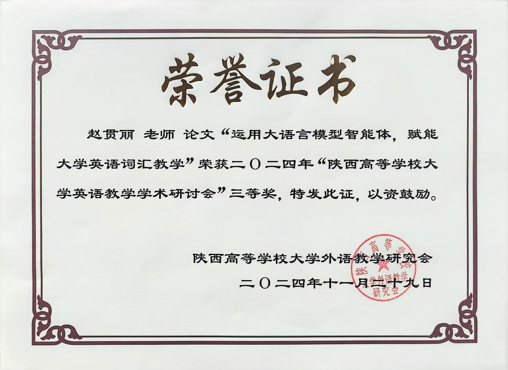 本网讯 近日,公司国际公司教师赵贯丽撰写的《运用大语言模型智能体,赋能大学英语词汇教学》论文在2024“陕西高等公司大学英语教学学术研讨会”论文评选中荣获优秀论文三等奖。