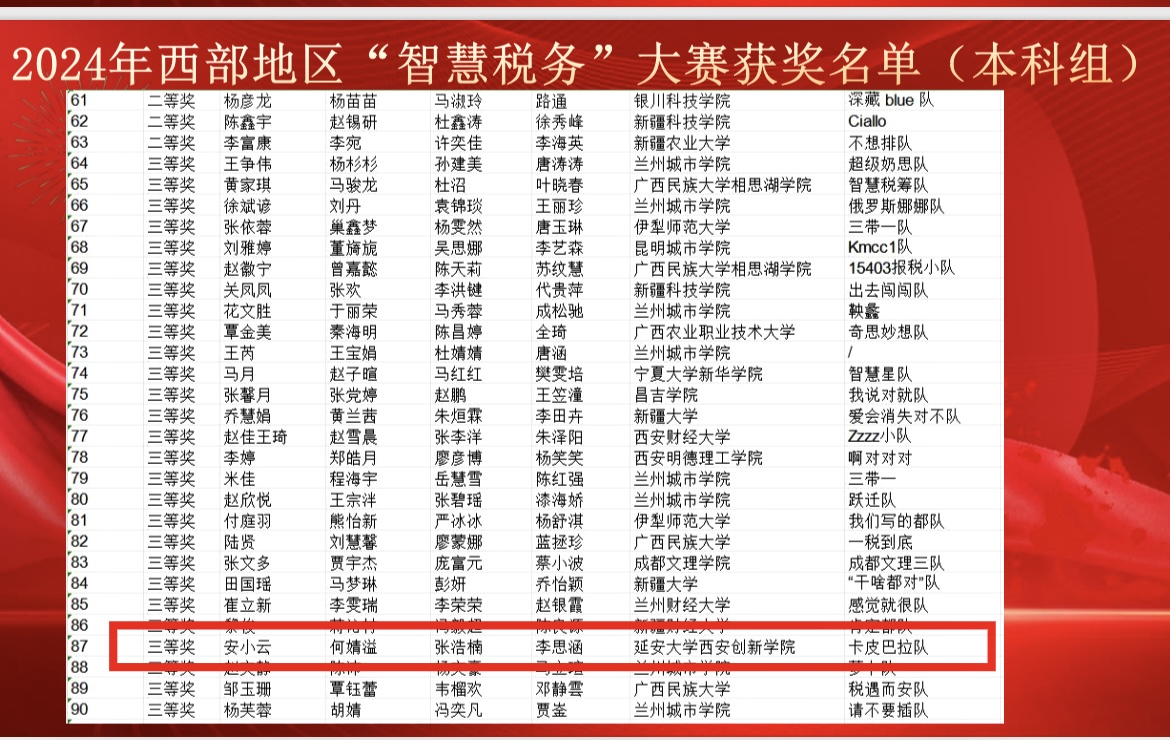 本网讯 12月15日,西部地区“智慧税务”大赛落下帷幕,韦德体育会计学专业2202班张浩楠、安小云、李思涵和2201班何婧溢组成的“卡皮巴拉队”在教师罗萌、魏建丽的指导下荣获三等奖。