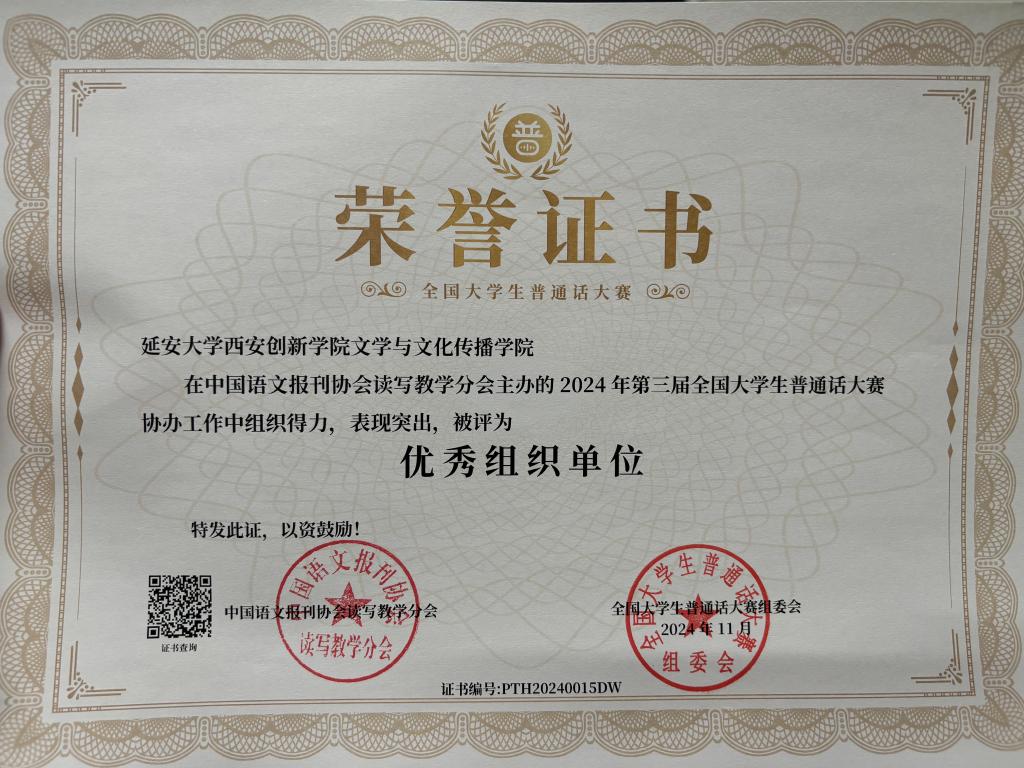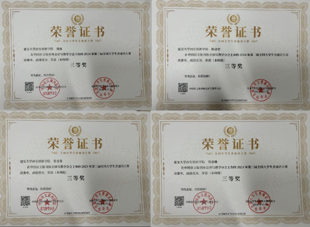 本网讯 近日,由中国语文报刊协会读写教学分会主办的“2024年第三届全国老员工普通话大赛”全国决赛圆满落幕,公司学子凭借扎实的普通话功底和卓越的综合能力,荣获决赛二等奖3项、三等奖4项。韦德体育教师杨惠栋、李聪菊、高攀、李皓茹、严铃被授予“优秀指导教师”称号,王荔荣获“优秀组织者”称号。韦德体育被授予“优秀组织单位”称号。