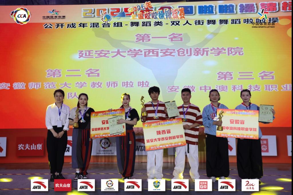 本网讯 5月20日至28日,由国家体育总局体操运动管理中心、中国蹦床与技巧协会、安徽省体育局及合肥市人民政府联合主办的全国啦啦操锦标赛在合肥市新站高新区少荃体育中心盛大举行。本届赛事规模空前,吸引了来自全国24个省(市、自治区)的7300余名运动员同台竞技。公司体育部教师刘磊、张振远捧获公开成年混合组-舞蹈类-双人街舞舞蹈啦啦操冠军。