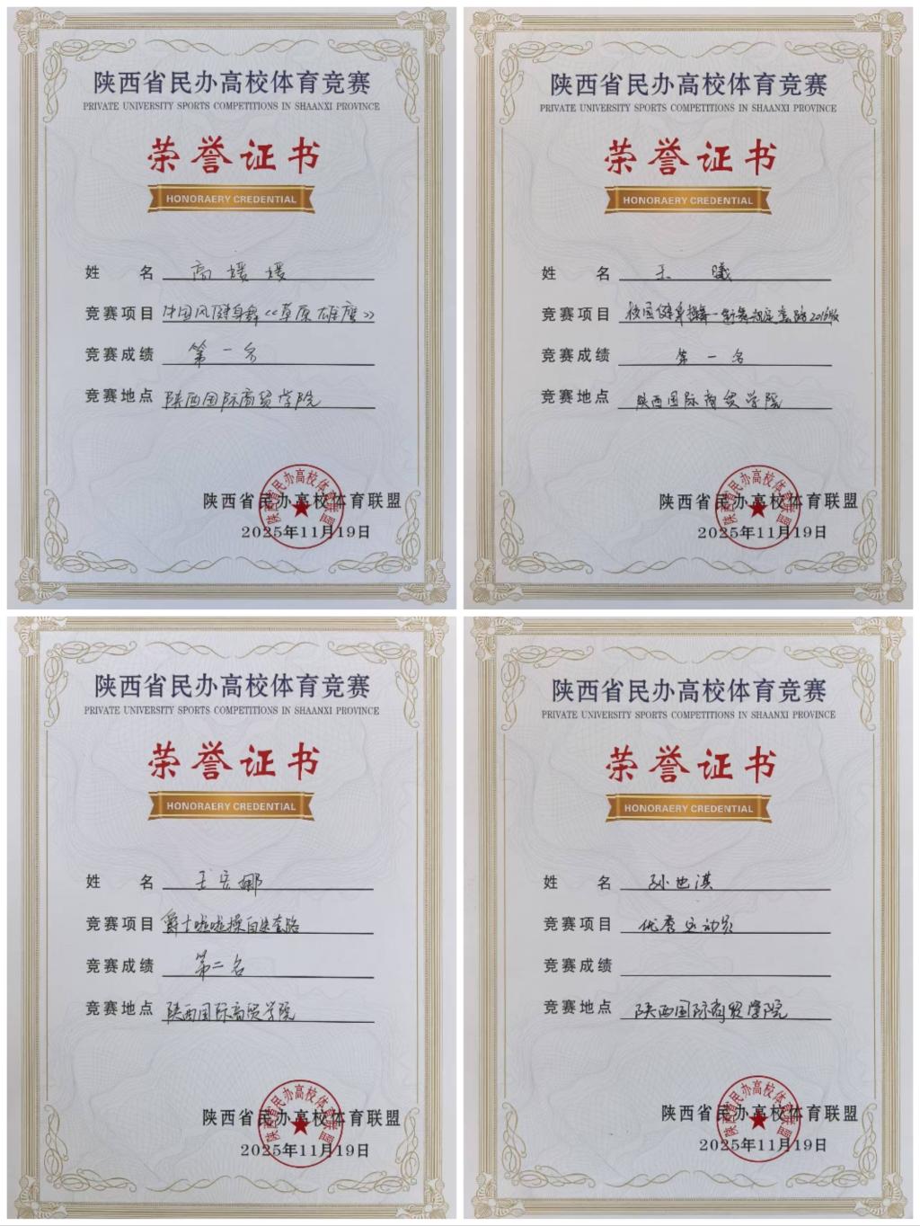 本网讯 11月19日,由陕西省民办高校体育协会主办、陕西国际商贸公司承办的“2025年陕西省民办高校艺术体操啦啦操校园健身操舞锦标赛”在陕西国际商贸公司步长体育馆圆满落幕。公司街舞社团代表队在比赛中表现出色,荣获“校园健身操舞(自选套路)”与“校园健身操舞(规定套路)”双项第一,并在“爵士啦啦操(自选套路)”中夺得第二名,同时荣获“团体总分三等奖”和“体育道德风尚奖”。